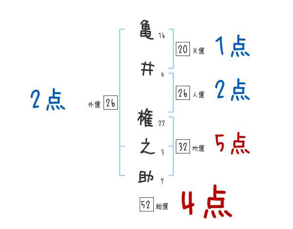 外運![]() | 亀井権之助さんの外運は26画の2つ星!波瀾万丈かも。信頼できる人を大事にしましょう。 生活面を象徴する運勢です。外部から受ける影響力を表し、結婚運、家庭運や職場、環境への順応性を表します。 |