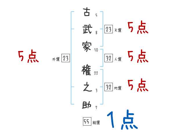 天運![]() | 古武家権之助さんの天運は23画の5つ星!想像力に優れ活力がある。一代で成功し名誉を手に入れる。 家系が持つ宿命的な運勢を表します。祖先から受け継いだ苗字ですので自分の力が及びません。家柄を象徴します。 |
