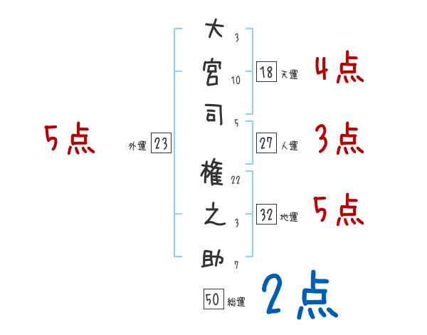 天運![]() | 大宮司権之助さんの天運は18画の4つ星!情熱的で剛気。忍耐力があり信頼される。 家系が持つ宿命的な運勢を表します。祖先から受け継いだ苗字ですので自分の力が及びません。家柄を象徴します。 |