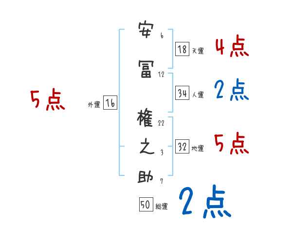 外運![]() | 安冨権之助さんの外運は16画の5つ星!人望が厚く大きく発展する。逆転成功が見える。 生活面を象徴する運勢です。外部から受ける影響力を表し、結婚運、家庭運や職場、環境への順応性を表します。 |
