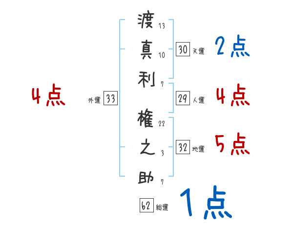 天運![]() | 渡真利権之助さんの天運は30画の2つ星!浮き沈みの激しさに注意しましょう。 家系が持つ宿命的な運勢を表します。祖先から受け継いだ苗字ですので自分の力が及びません。家柄を象徴します。 |