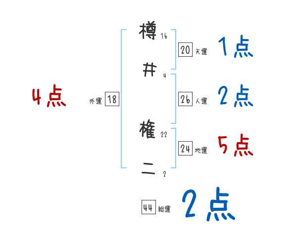 総運![]() | 樽井権二さんの総運は44画の2つ星!誠実で慎重な性格。物事を考えすぎないように注意しましょう。 あなたの人生を表す1番重要な運勢です。生涯を通じて影響する総合運となり、主に50歳以降の晩年期に影響を及ぼします。 |