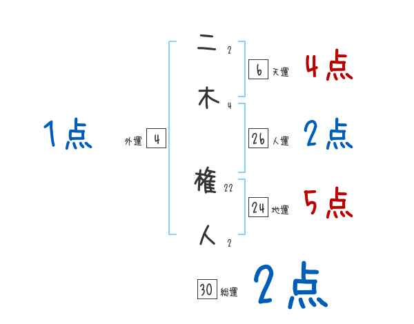 総運![]() | 二木権人さんの総運は30画の2つ星!浮き沈みの激しさに注意しましょう。 あなたの人生を表す1番重要な運勢です。生涯を通じて影響する総合運となり、主に50歳以降の晩年期に影響を及ぼします。 |