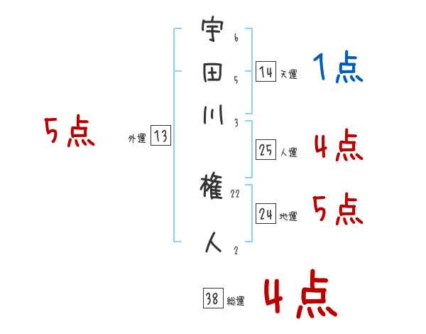 天運![]() | 宇田川権人さんの天運は14画の1つ星!人に対して優しいがストレスを溜め込みがち。人間関係のトラブルを避けるよう気をつけましょう。 家系が持つ宿命的な運勢を表します。祖先から受け継いだ苗字ですので自分の力が及びません。家柄を象徴します。 |