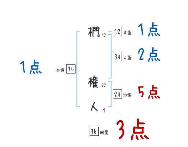 天運![]() | 椚権人さんの天運は12画の1つ星!簡単な失敗で諦めてしまいやすいかも。着実に行動すると良いでしょう。 家系が持つ宿命的な運勢を表します。祖先から受け継いだ苗字ですので自分の力が及びません。家柄を象徴します。 |