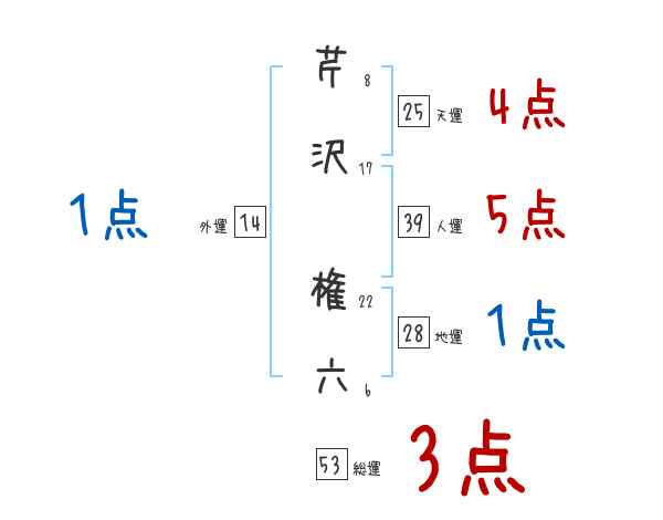 総運![]() | 芹沢権六さんの総運は53画の3つ星!やや見栄っ張りで虚栄心がある。散財に注意。 あなたの人生を表す1番重要な運勢です。生涯を通じて影響する総合運となり、主に50歳以降の晩年期に影響を及ぼします。 |