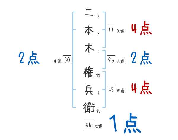 二本木権兵衛さんの画数の鑑定結果