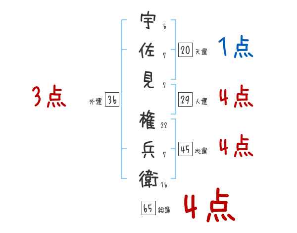 地運![]() | 宇佐見権兵衛さんの地運は45画の4つ星!もくもくと物事を進め達成する。地味な努力家。 個性を表す基礎的な運勢です。性格形成や対人関係、行動力など家庭環境に影響されます。主に誕生してから20歳くらいまでの若年期の運勢を表します。 |