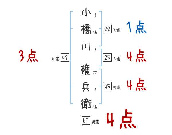 地運![]() | 小橋川権兵衛さんの地運は45画の4つ星!もくもくと物事を進め達成する。地味な努力家。 個性を表す基礎的な運勢です。性格形成や対人関係、行動力など家庭環境に影響されます。主に誕生してから20歳くらいまでの若年期の運勢を表します。 |