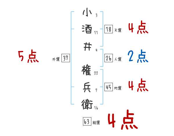 外運![]() | 小酒井権兵衛さんの外運は37画の5つ星!努力家で順応性に優れる。現実的な考え方ができ忠実に物事をこなす。 生活面を象徴する運勢です。外部から受ける影響力を表し、結婚運、家庭運や職場、環境への順応性を表します。 |