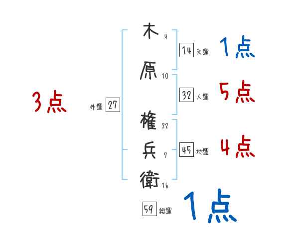 人運![]() | 木原権兵衛さんの人運は32画の5つ星!柔軟性があり成功する。チャンスが多く金運が良い。 性格や才能などを表す2番目に重要な運勢です。人間関係や協調性、社会的な成功に影響します。主に20歳から50歳ぐらいまでの中年期の運勢を表します。 |