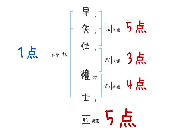 天運![]() | 早矢仕権士さんの天運は16画の5つ星!人望が厚く大きく発展する。逆転成功が見える。 家系が持つ宿命的な運勢を表します。祖先から受け継いだ苗字ですので自分の力が及びません。家柄を象徴します。 |