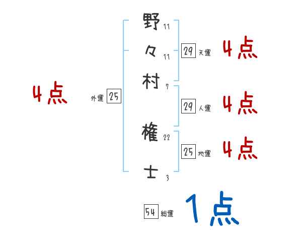 天運![]() | 野々村権士さんの天運は29画の4つ星!完全主義で才能がある。厳格な心の持ち主。 家系が持つ宿命的な運勢を表します。祖先から受け継いだ苗字ですので自分の力が及びません。家柄を象徴します。 |