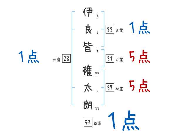 人運![]() | 伊良皆権太朗さんの人運は31画の5つ星!社交性があり判断力に優れる。順風満帆な人生で円満な生活。 性格や才能などを表す2番目に重要な運勢です。人間関係や協調性、社会的な成功に影響します。主に20歳から50歳ぐらいまでの中年期の運勢を表します。 |