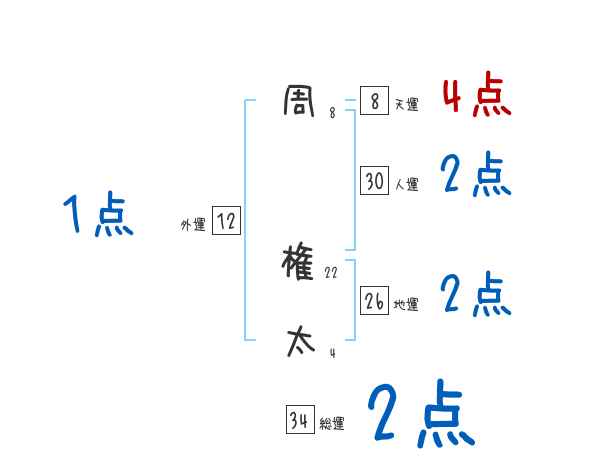 総運![]() | 周権太さんの総運は34画の2つ星!独創性に優れるが、自尊心が強く災難に注意しましょう。 あなたの人生を表す1番重要な運勢です。生涯を通じて影響する総合運となり、主に50歳以降の晩年期に影響を及ぼします。 |