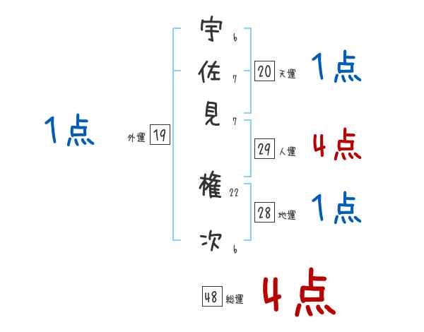 外運![]() | 宇佐見権次さんの外運は19画の1つ星!優れた才能を持ちますが、協調性が足りないことも。周りの人と協力する事を意識しましょう。 生活面を象徴する運勢です。外部から受ける影響力を表し、結婚運、家庭運や職場、環境への順応性を表します。 |