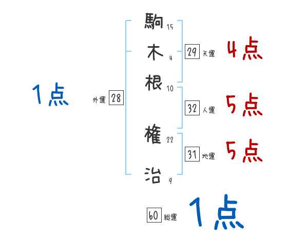 人運![]() | 駒木根権治さんの人運は32画の5つ星!柔軟性があり成功する。チャンスが多く金運が良い。 性格や才能などを表す2番目に重要な運勢です。人間関係や協調性、社会的な成功に影響します。主に20歳から50歳ぐらいまでの中年期の運勢を表します。 |