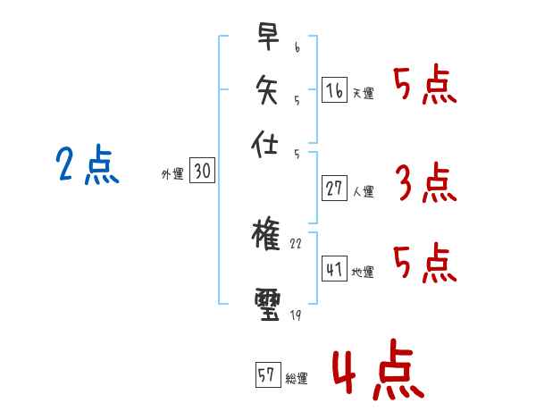 人運![]() | 早矢仕権璽さんの人運は27画の3つ星!頭脳明晰だが強情で摩擦が多い傾向。孤立に注意。 性格や才能などを表す2番目に重要な運勢です。人間関係や協調性、社会的な成功に影響します。主に20歳から50歳ぐらいまでの中年期の運勢を表します。 |