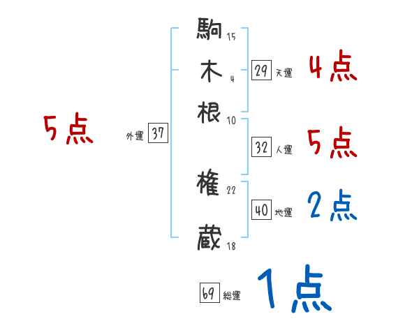 人運![]() | 駒木根権蔵さんの人運は32画の5つ星!柔軟性があり成功する。チャンスが多く金運が良い。 性格や才能などを表す2番目に重要な運勢です。人間関係や協調性、社会的な成功に影響します。主に20歳から50歳ぐらいまでの中年期の運勢を表します。 |