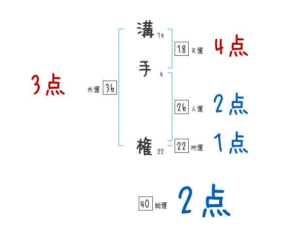 天運![]() | 溝手権さんの天運は18画の4つ星!情熱的で剛気。忍耐力があり信頼される。 家系が持つ宿命的な運勢を表します。祖先から受け継いだ苗字ですので自分の力が及びません。家柄を象徴します。 |