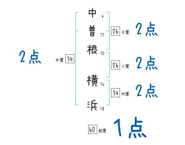 天運![]() | 中曽根横浜さんの天運は26画の2つ星!波瀾万丈かも。信頼できる人を大事にしましょう。 家系が持つ宿命的な運勢を表します。祖先から受け継いだ苗字ですので自分の力が及びません。家柄を象徴します。 |