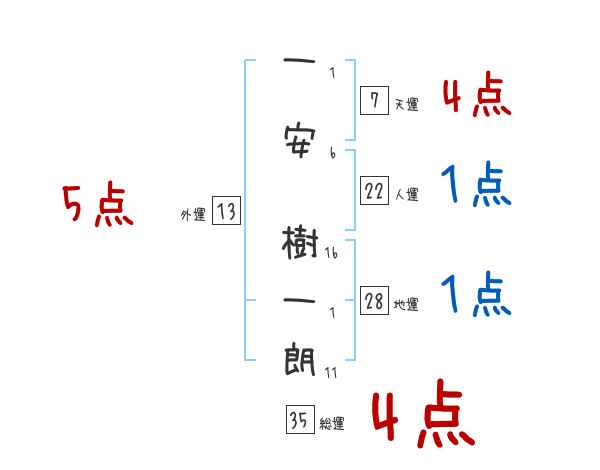 天運![]() | 一安樹一朗さんの天運は7画の4つ星!強い意志や信念を持ち独立心が強い。自立する。 家系が持つ宿命的な運勢を表します。祖先から受け継いだ苗字ですので自分の力が及びません。家柄を象徴します。 |