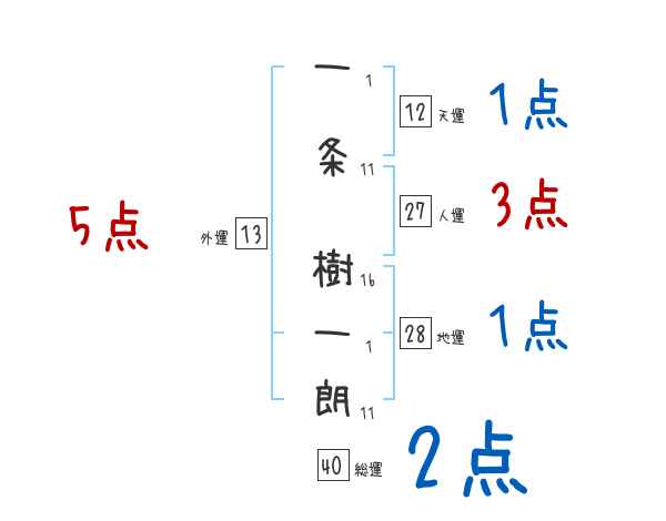 外運![]() | 一条樹一朗さんの外運は13画の5つ星!才能に恵まれ人気がある。名声を手に入れる。円満な人生。 生活面を象徴する運勢です。外部から受ける影響力を表し、結婚運、家庭運や職場、環境への順応性を表します。 |