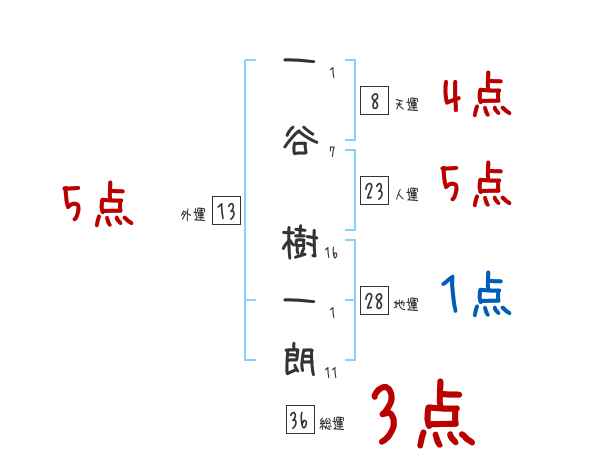 人運![]() | 一谷樹一朗さんの人運は23画の5つ星!想像力に優れ活力がある。一代で成功し名誉を手に入れる。 性格や才能などを表す2番目に重要な運勢です。人間関係や協調性、社会的な成功に影響します。主に20歳から50歳ぐらいまでの中年期の運勢を表します。 |