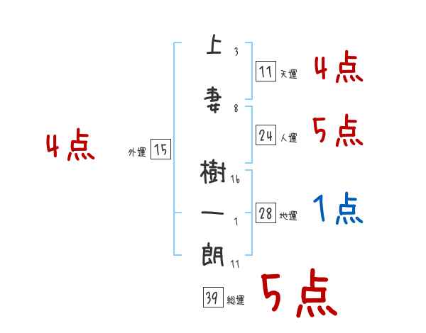 人運![]() | 上妻樹一朗さんの人運は24画の5つ星!家庭運が良く順調な人生。金運にも恵まれる。 性格や才能などを表す2番目に重要な運勢です。人間関係や協調性、社会的な成功に影響します。主に20歳から50歳ぐらいまでの中年期の運勢を表します。 |