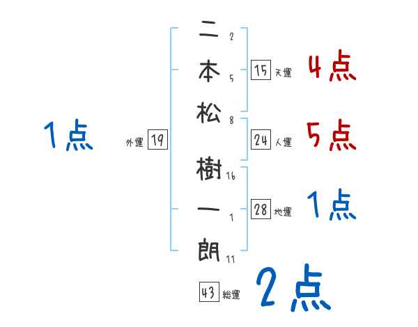 総運![]() | 二本松樹一朗さんの総運は43画の2つ星!頑固な性格で独立心が強いかも。やや非現実的で浪費に注意しましょう。 あなたの人生を表す1番重要な運勢です。生涯を通じて影響する総合運となり、主に50歳以降の晩年期に影響を及ぼします。 |