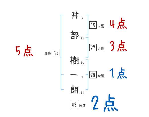 外運![]() | 井部樹一朗さんの外運は16画の5つ星!人望が厚く大きく発展する。逆転成功が見える。 生活面を象徴する運勢です。外部から受ける影響力を表し、結婚運、家庭運や職場、環境への順応性を表します。 |