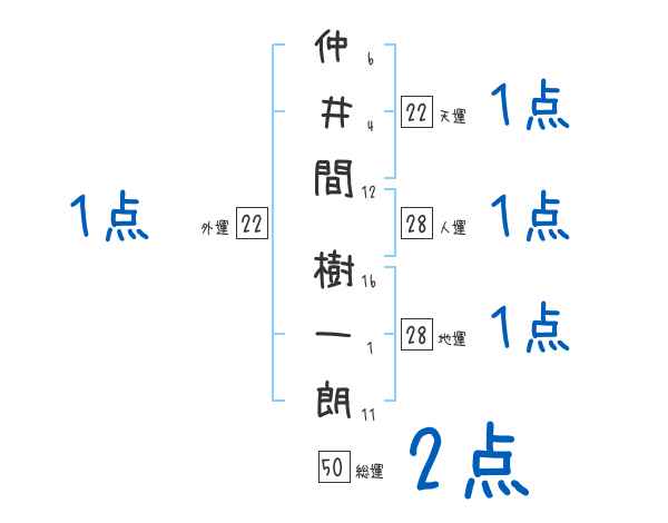 天運![]() | 仲井間樹一朗さんの天運は22画の1つ星!努力することが苦手ないっぽう手先が器用。芸術性にも優れる。 家系が持つ宿命的な運勢を表します。祖先から受け継いだ苗字ですので自分の力が及びません。家柄を象徴します。 |
