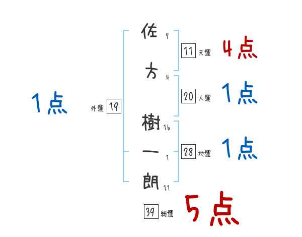天運![]() | 佐方樹一朗さんの天運は11画の4つ星!着実に富や地位を得る幸運な人生。 家系が持つ宿命的な運勢を表します。祖先から受け継いだ苗字ですので自分の力が及びません。家柄を象徴します。 |