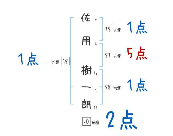 天運![]() | 佐用樹一朗さんの天運は12画の1つ星!簡単な失敗で諦めてしまいやすいかも。着実に行動すると良いでしょう。 家系が持つ宿命的な運勢を表します。祖先から受け継いだ苗字ですので自分の力が及びません。家柄を象徴します。 |