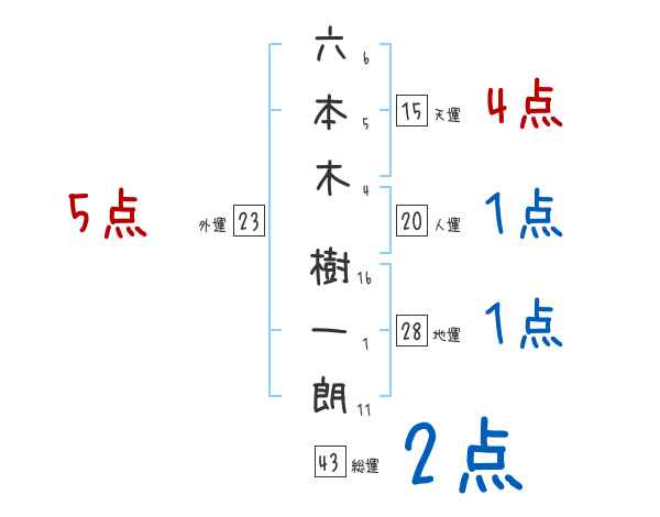 外運![]() | 六本木樹一朗さんの外運は23画の5つ星!想像力に優れ活力がある。一代で成功し名誉を手に入れる。 生活面を象徴する運勢です。外部から受ける影響力を表し、結婚運、家庭運や職場、環境への順応性を表します。 |