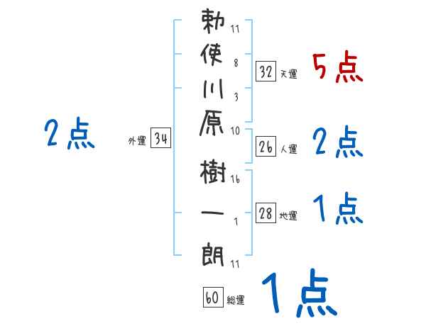 天運![]() | 勅使川原樹一朗さんの天運は32画の5つ星!柔軟性があり成功する。チャンスが多く金運が良い。 家系が持つ宿命的な運勢を表します。祖先から受け継いだ苗字ですので自分の力が及びません。家柄を象徴します。 |