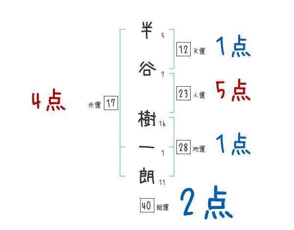 外運![]() | 半谷樹一朗さんの外運は17画の4つ星!積極的な行動力。地位を気づき財産を手に入れる。純粋な心と直感力。 生活面を象徴する運勢です。外部から受ける影響力を表し、結婚運、家庭運や職場、環境への順応性を表します。 |