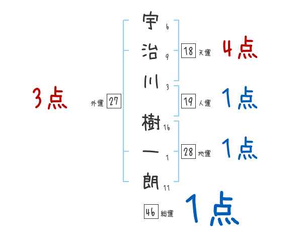 人運![]() | 宇治川樹一朗さんの人運は19画の1つ星!優れた才能を持ちますが、協調性が足りないことも。周りの人と協力する事を意識しましょう。 性格や才能などを表す2番目に重要な運勢です。人間関係や協調性、社会的な成功に影響します。主に20歳から50歳ぐらいまでの中年期の運勢を表します。 |
