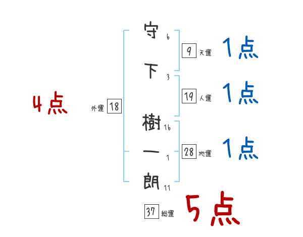 天運![]() | 守下樹一朗さんの天運は9画の1つ星!消極的で才能を発揮することが苦手なことも。周りの意見に耳を傾けましょう。 家系が持つ宿命的な運勢を表します。祖先から受け継いだ苗字ですので自分の力が及びません。家柄を象徴します。 |