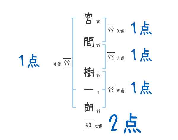 外運![]() | 宮間樹一朗さんの外運は22画の1つ星!努力することが苦手ないっぽう手先が器用。芸術性にも優れる。 生活面を象徴する運勢です。外部から受ける影響力を表し、結婚運、家庭運や職場、環境への順応性を表します。 |