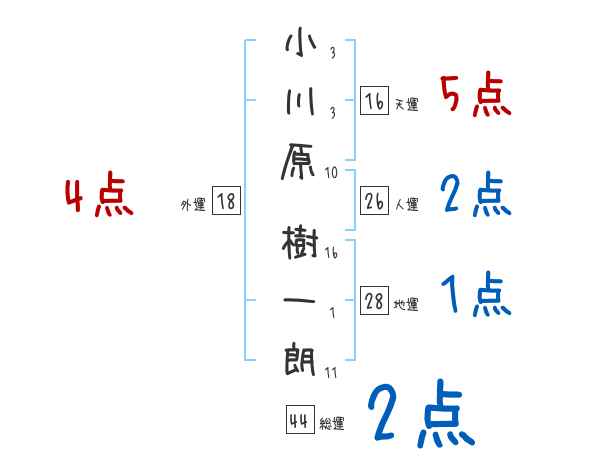 総運![]() | 小川原樹一朗さんの総運は44画の2つ星!誠実で慎重な性格。物事を考えすぎないように注意しましょう。 あなたの人生を表す1番重要な運勢です。生涯を通じて影響する総合運となり、主に50歳以降の晩年期に影響を及ぼします。 |