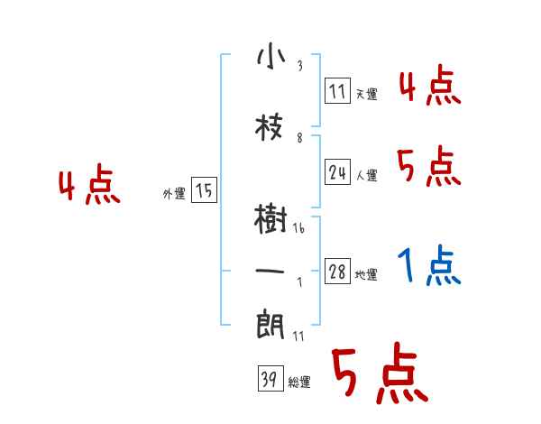 人運![]() | 小枝樹一朗さんの人運は24画の5つ星!家庭運が良く順調な人生。金運にも恵まれる。 性格や才能などを表す2番目に重要な運勢です。人間関係や協調性、社会的な成功に影響します。主に20歳から50歳ぐらいまでの中年期の運勢を表します。 |