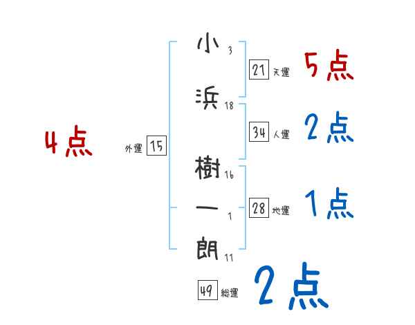 天運![]() | 小浜樹一朗さんの天運は21画の5つ星!統率力がある。独立し成功する。名誉を手に入れる。 家系が持つ宿命的な運勢を表します。祖先から受け継いだ苗字ですので自分の力が及びません。家柄を象徴します。 |
