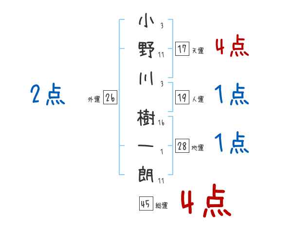 天運![]() | 小野川樹一朗さんの天運は17画の4つ星!積極的な行動力。地位を気づき財産を手に入れる。純粋な心と直感力。 家系が持つ宿命的な運勢を表します。祖先から受け継いだ苗字ですので自分の力が及びません。家柄を象徴します。 |