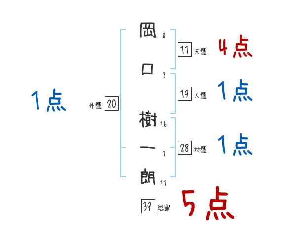 総運![]() | 岡口樹一朗さんの総運は39画の5つ星!社交性に優れ人望が厚い。人の上に立ち成功する。 あなたの人生を表す1番重要な運勢です。生涯を通じて影響する総合運となり、主に50歳以降の晩年期に影響を及ぼします。 |