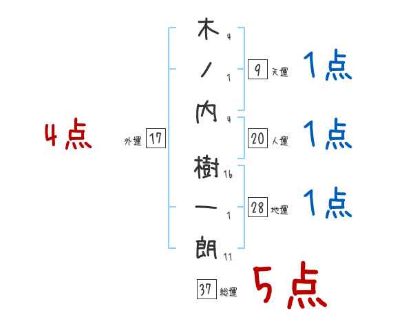 外運![]() | 木ノ内樹一朗さんの外運は17画の4つ星!積極的な行動力。地位を気づき財産を手に入れる。純粋な心と直感力。 生活面を象徴する運勢です。外部から受ける影響力を表し、結婚運、家庭運や職場、環境への順応性を表します。 |