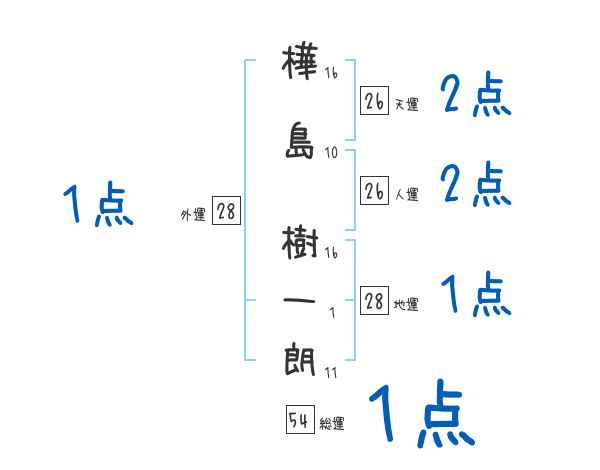 外運![]() | 樺島樹一朗さんの外運は28画の1つ星!家庭環境に注意。スポーツで活躍できる能力があるかも。 生活面を象徴する運勢です。外部から受ける影響力を表し、結婚運、家庭運や職場、環境への順応性を表します。 |
