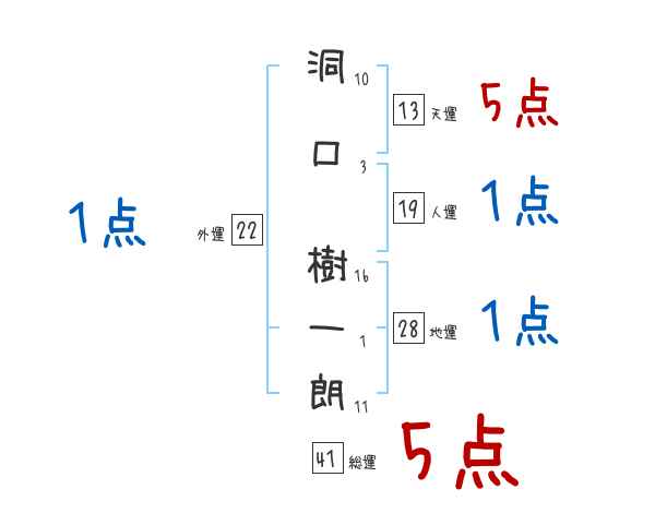 天運![]() | 洞口樹一朗さんの天運は13画の5つ星!才能に恵まれ人気がある。名声を手に入れる。円満な人生。 家系が持つ宿命的な運勢を表します。祖先から受け継いだ苗字ですので自分の力が及びません。家柄を象徴します。 |