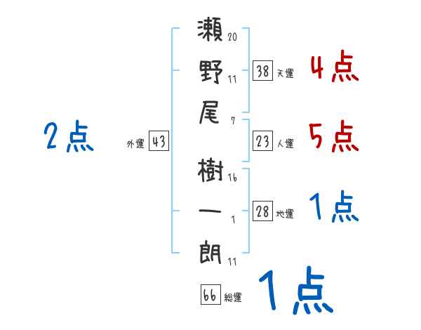 人運![]() | 瀬野尾樹一朗さんの人運は23画の5つ星!想像力に優れ活力がある。一代で成功し名誉を手に入れる。 性格や才能などを表す2番目に重要な運勢です。人間関係や協調性、社会的な成功に影響します。主に20歳から50歳ぐらいまでの中年期の運勢を表します。 |