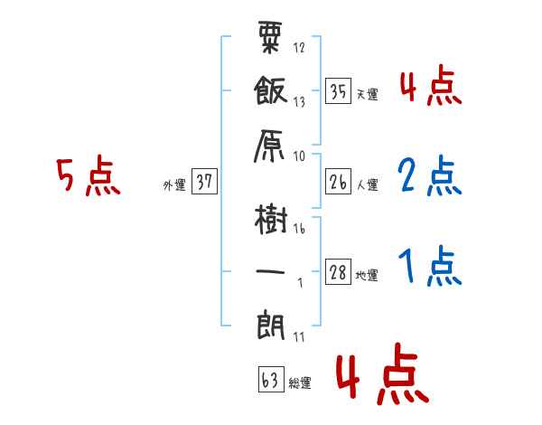 外運![]() | 粟飯原樹一朗さんの外運は37画の5つ星!努力家で順応性に優れる。現実的な考え方ができ忠実に物事をこなす。 生活面を象徴する運勢です。外部から受ける影響力を表し、結婚運、家庭運や職場、環境への順応性を表します。 |